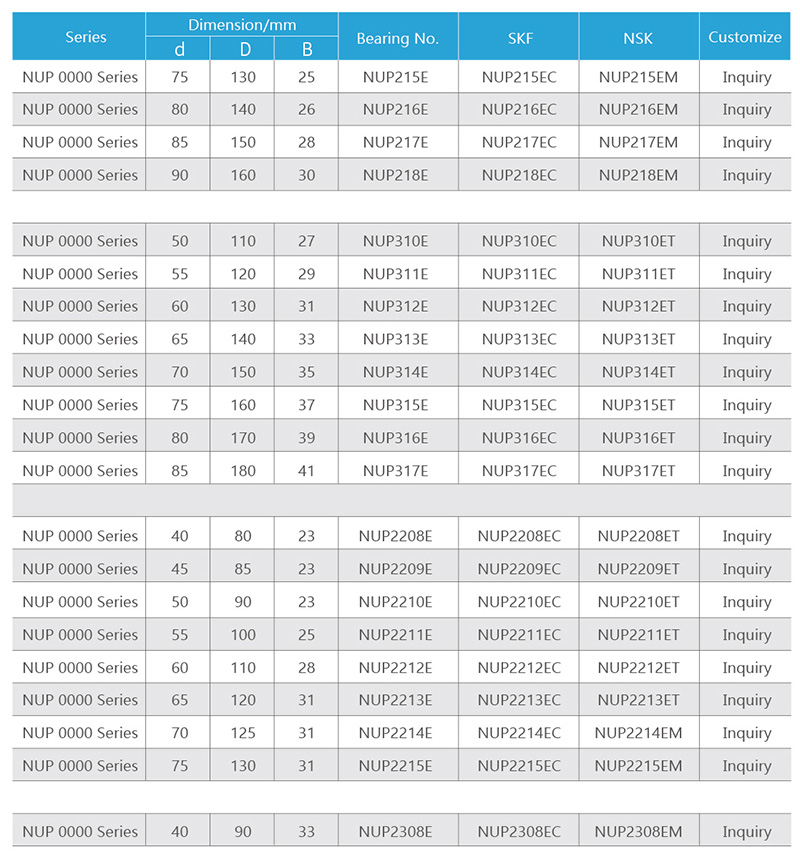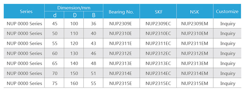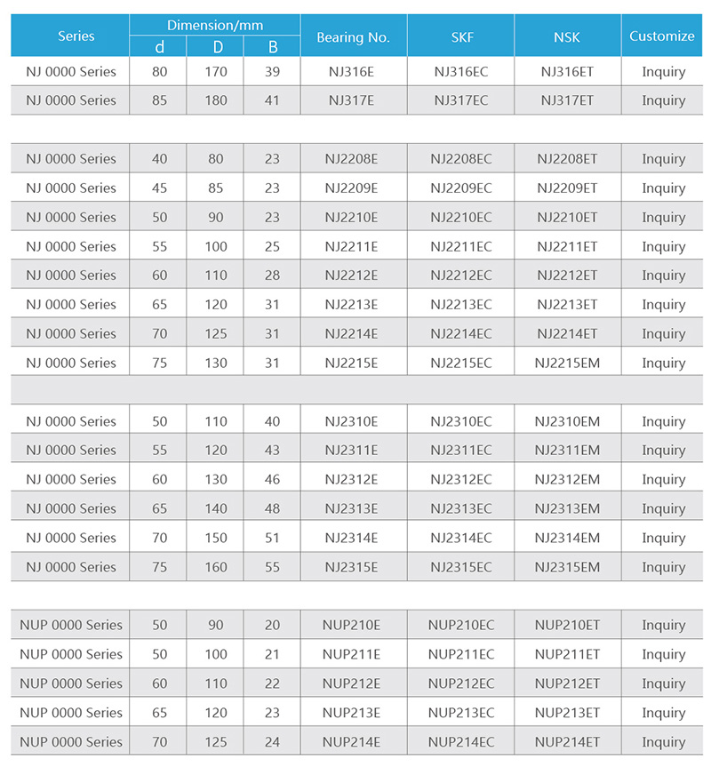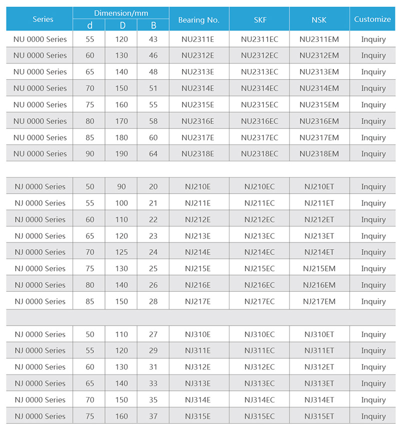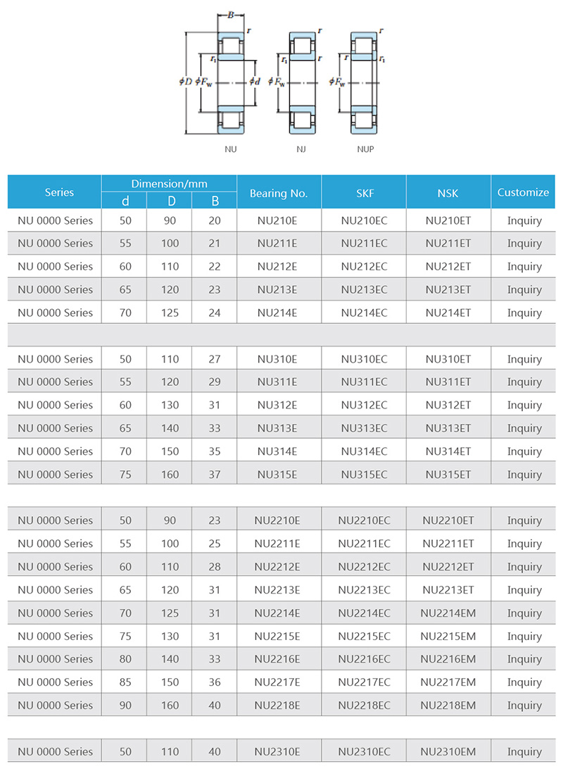 Cylindrical roller bearing is in linear contact with the rollers and has a large radial load capacity. It mainly bears radial load and is suitable for heavy load and impact load. When the friction between the rolling elements and the rib is small, it is suitable for high-speed rotation. According to the presence or absence of ribs, it can be divided into NU, NJ, NUP, N, NF types.