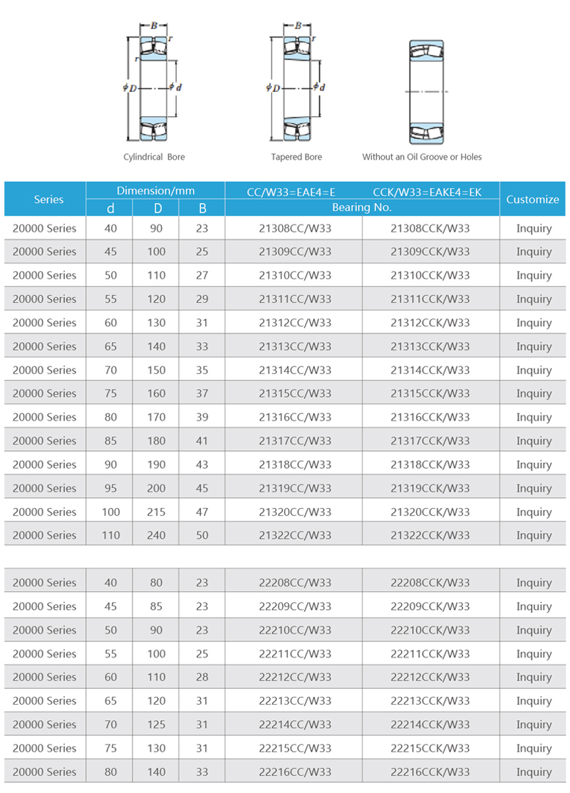 Spherical roller bearings are bearings with spherical rollers assembled between an inner ring with two raceways and an outer ring with spherical raceway. The bearings possess two rows of rollers, mainly withstanding radial load, and at the same time withstanding any of an axial load direction. With high radial load capacity, it is especially suitable for working under heavy load or vibration load.