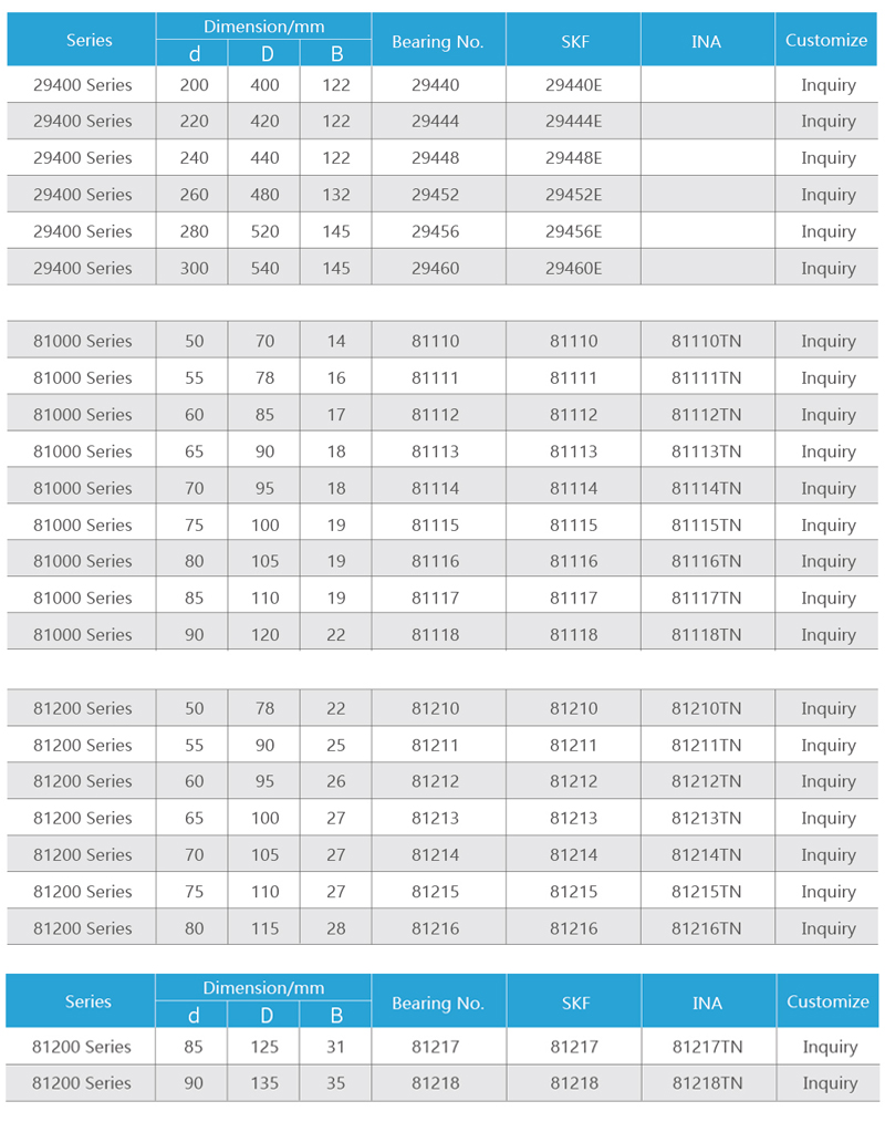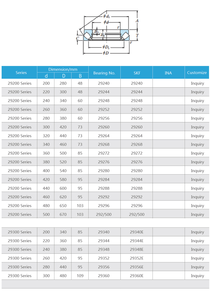 Thrust spherical roller bearing is separate bearing, whose roller and cage assembly and housing washer can be installed separately. It can be used in extremely heavy load occasions and has high rotation speed. The load action line and the axis of the bearing form a certain angle, so the axial load capacity is very large.